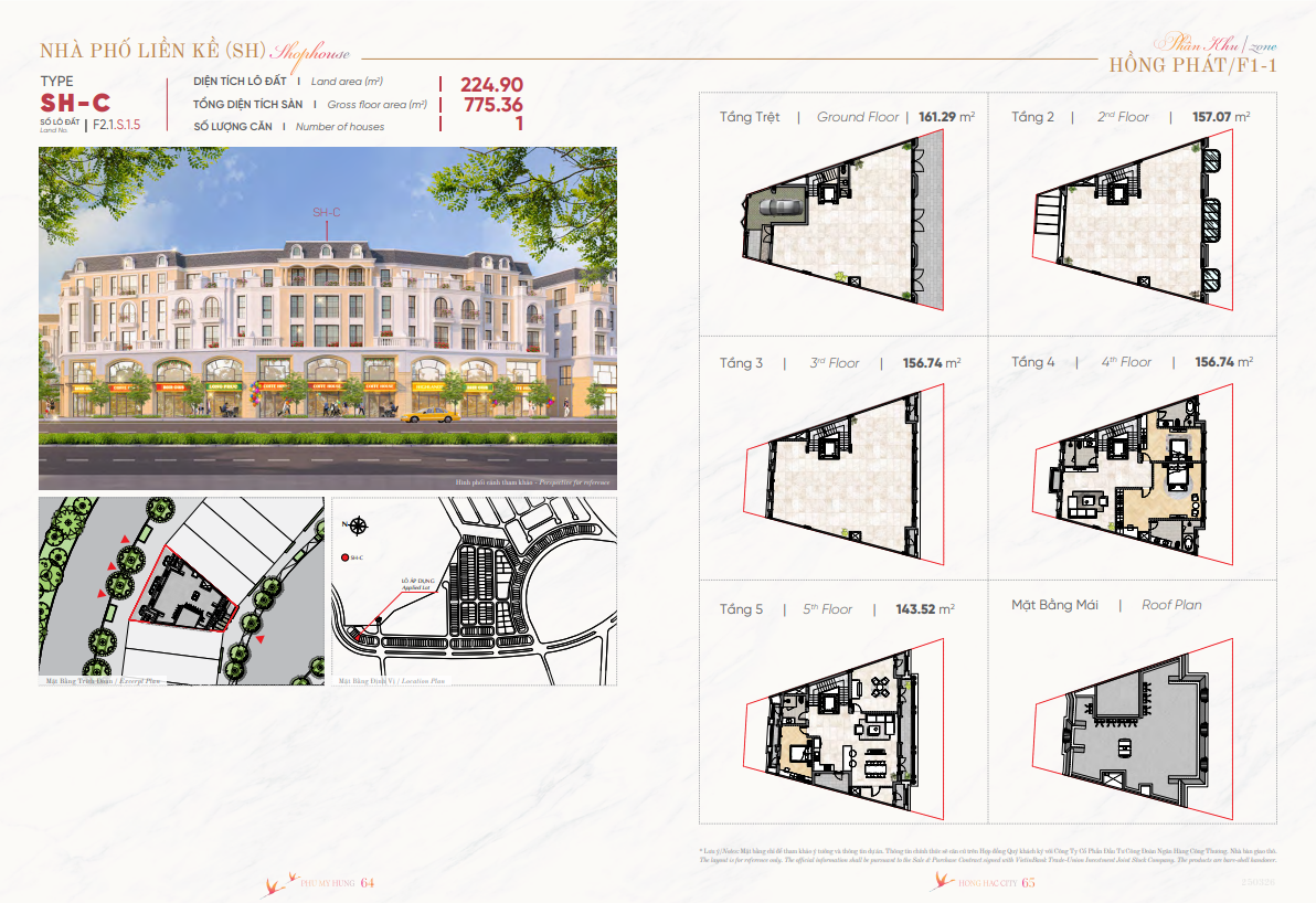Shophouse thương mại tại Hồng Hạc City là sự lựa chọn hoàn hảo cho các nhà đầu tư hoặc gia đình mong muốn kết hợp giữa kinh doanh và định cư lâu dài. Diện tích đất tiêu chuẩn là 6x20m (các căn góc sở hữu diện tích lớn hơn), mỗi căn được xây dựng 5 tầng, với mặt ngoài mang phong cách tân bán cổ điển Pháp đầy cuốn hút và phần bên trong để thô, sẵn sàng cho việc tùy chỉnh. Tổng diện tích sàn dao động từ 405m2 đến 427m2, đáp ứng nhu cầu đa dạng.
